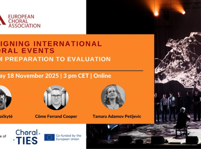 Rewatch the last Choral TIES webinar Designing International Events: From Preparation to Evaluation How do you bring an international choral event to life, from the first idea to the final evaluation?