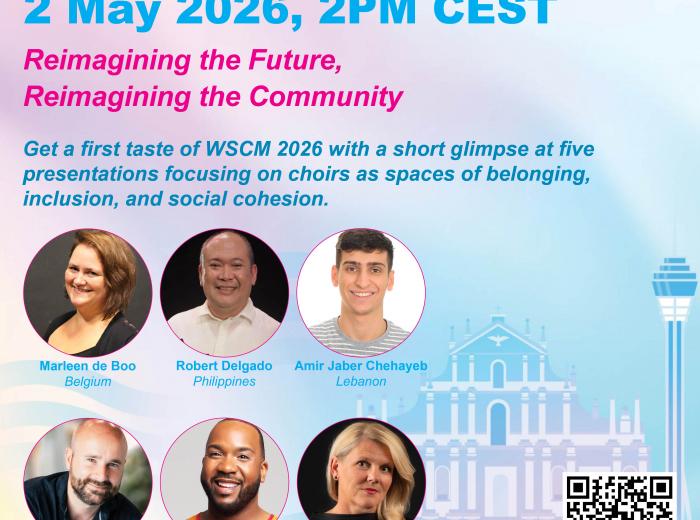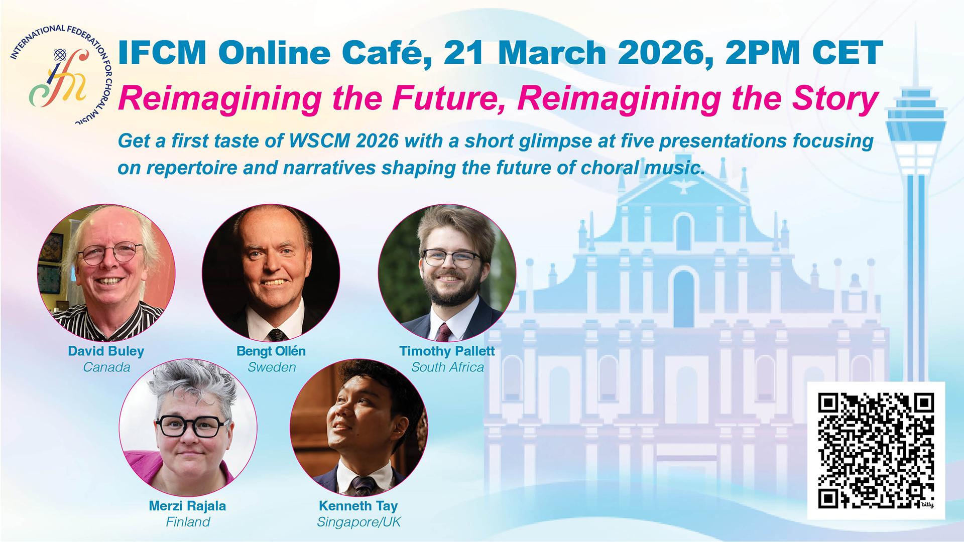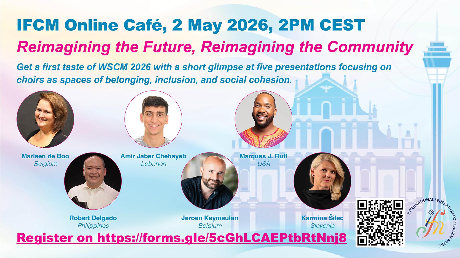 IFCM International Online Cafes are open to everyone! Recordings are available to IFCM members only. Since the first online meeting in 2023, IFCM has invited prestigious choral leaders, conductors and composers, from all over the world: Maria Guinand (Venezuela), Eric Banks (USA), Michael Ostrzyga (Germany), Tracy Wong (Malaysia/Canada), Luz Helena Peñaranda (Colombia), Joel Magus P. Navarro (Philippines), Ana María Raga (Venezuela), Carmen Acevedo (Puerto Rico), Jurģis Cābulis (Latvia), Lim Ai Hooi (Singap