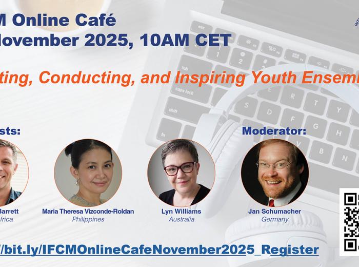 IFCM International Online Cafes are open to everyone! Recordings are available to IFCM members only. Since the first online meeting in 2023, IFCM has invited prestigious choral leaders, conductors and composers, from all over the world: Maria Guinand (Venezuela), Eric Banks (USA), Michael Ostrzyga (Germany), Tracy Wong (Malaysia/Canada), Luz Helena Peñaranda (Colombia), Joel Magus P. Navarro (Philippines), Ana María Raga (Venezuela), Carmen Acevedo (Puerto Rico), Jurģis Cābulis (Latvia), Lim Ai Hooi (Singap
